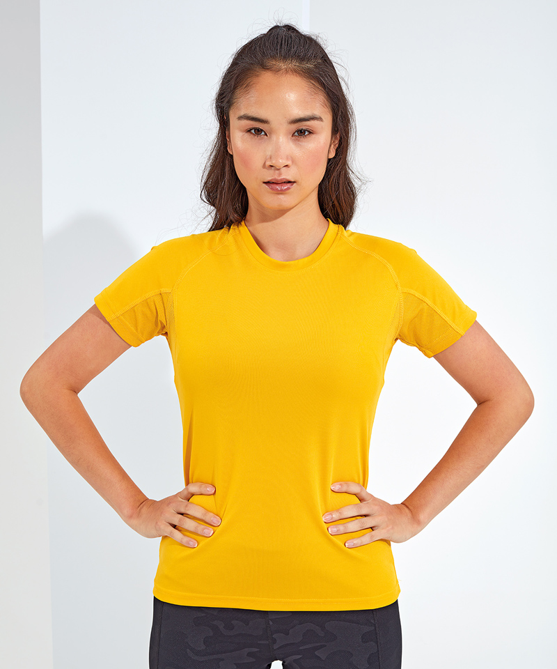 Sportliches T-Shirt für Damen mit Rundhalsausschnitt und Mesh-Einsatz im Rücken sowie unter den Armen für hohe Atmungsaktivität und zum Ableiten von Feuchtigkeit. Schulternähte und Raglanärmel sorgen für Komfort.